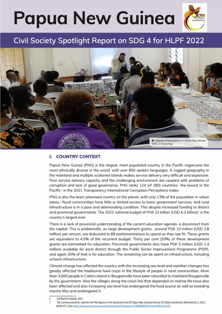 Click here to read: Papua New Guinea – Civil Society Spotlight Report on SDG 4 for HLPF 2022