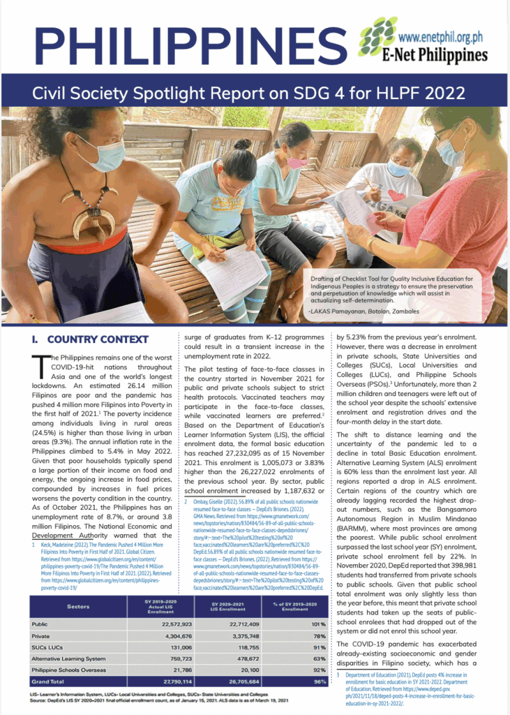 Philippines – Civil Society Spotlight Report on SDG 4 for HLPF 2022