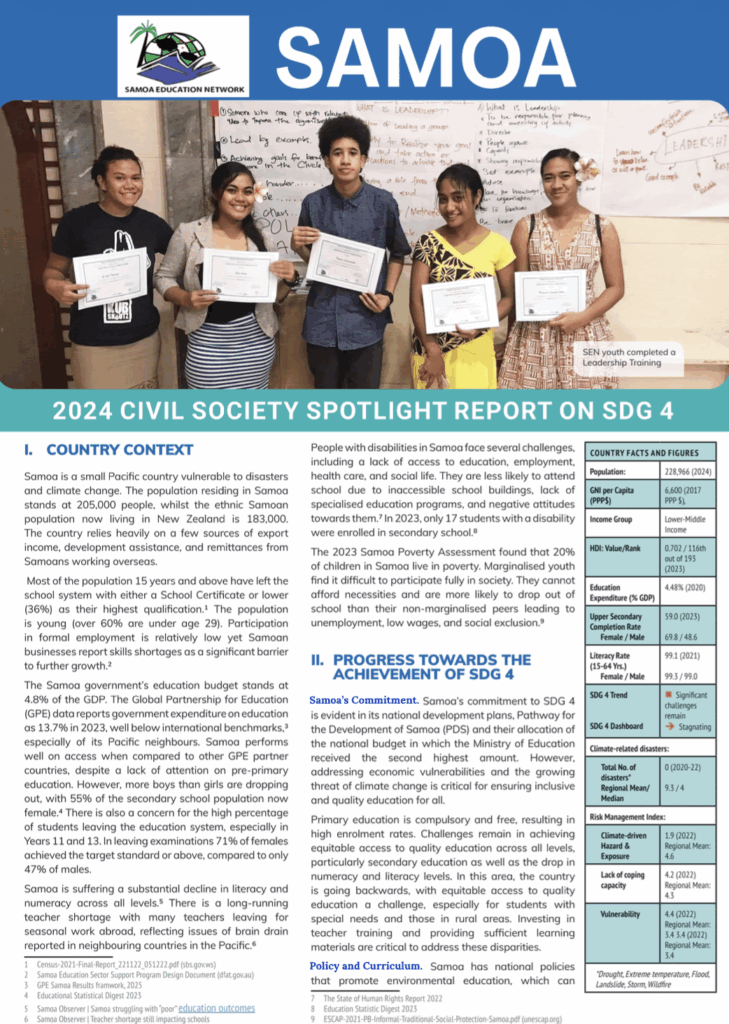 Click here to read: SAMOA – Civil Society Spotlight Report on SDG 4 for HLPF 2024