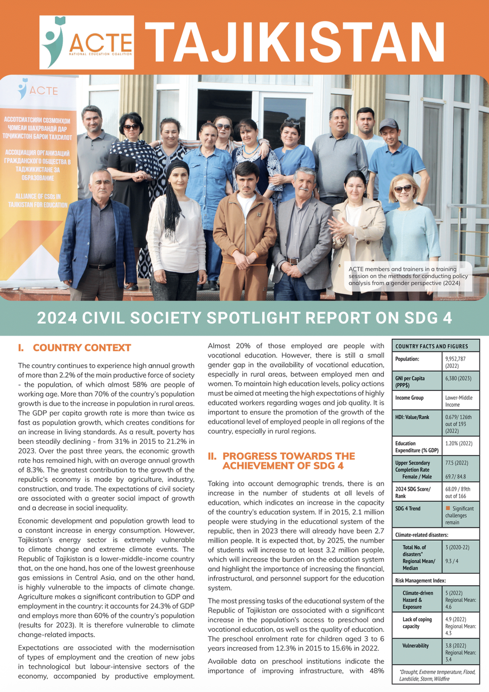 Click here to read: TAJIKISTAN – Civil Society Spotlight Report on SDG 4 for HLPF 2024